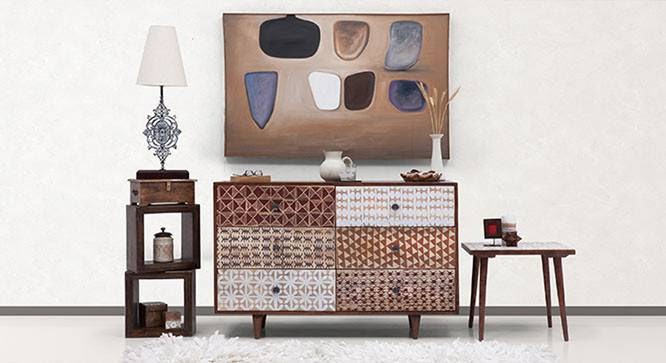 The Emaada Chest of Drawers mixes mid century modern forms with ethnic tribal patterns to create a beautifully eclectic style. Generously sized, this versatile stunner can be used in the living or dining rooms, or in the bedroom as a dresser